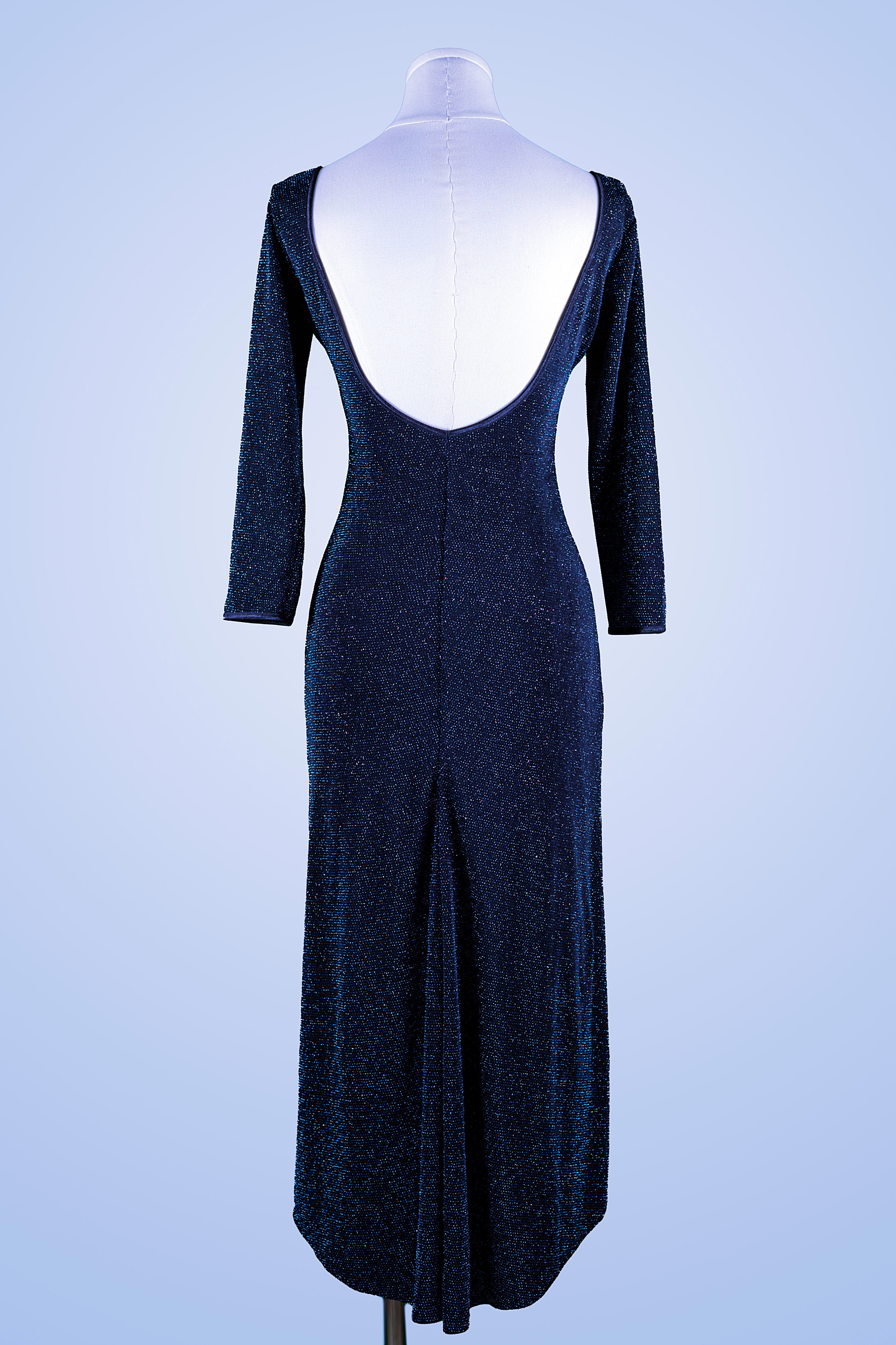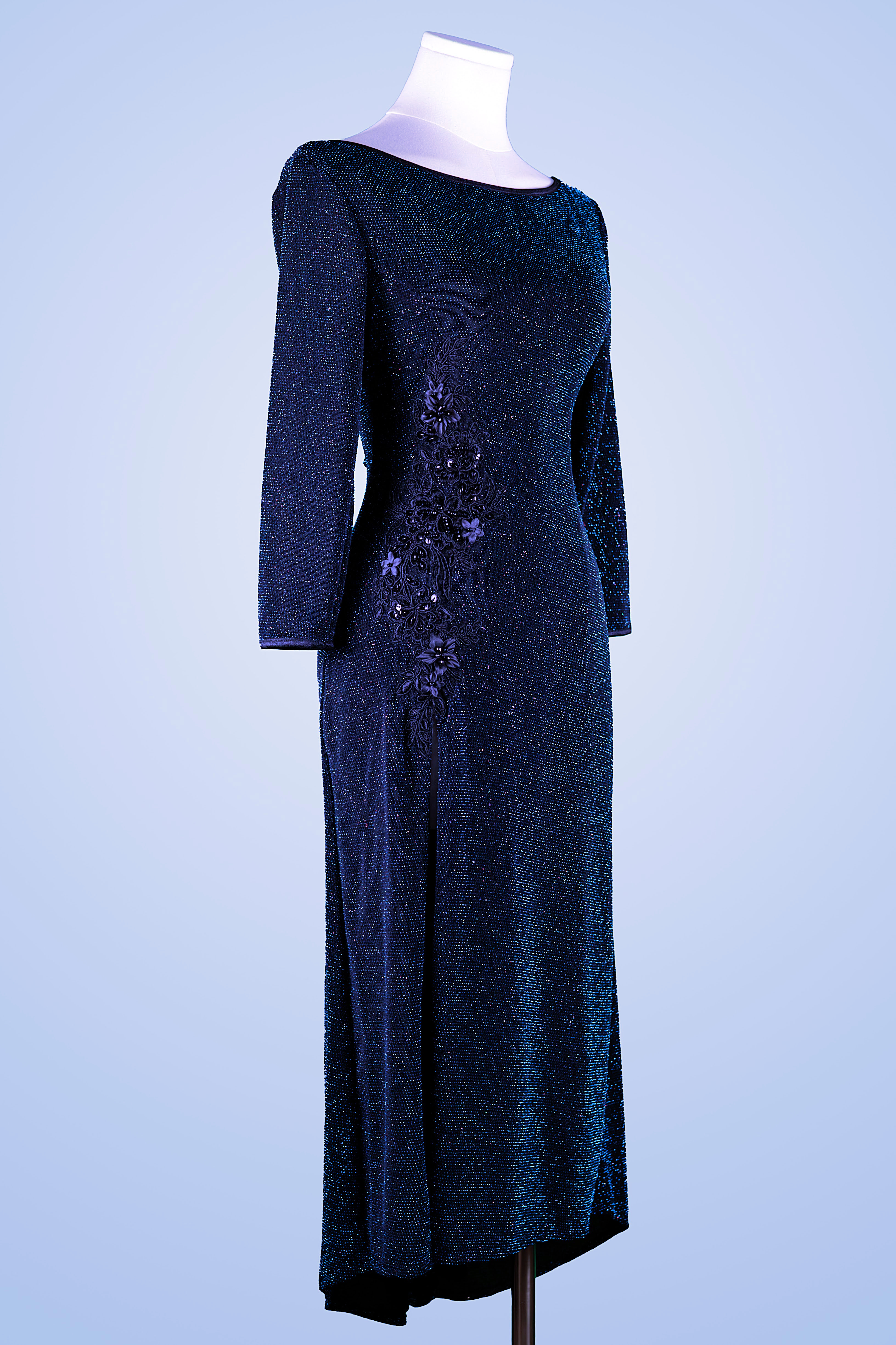 Step into the spotlight in a shimmery blue multi color side slit specially made for Tango special events. Our new Balada low back silhouette has a dramatic side slit meant to be wooing on center stage. Applique front detail.
