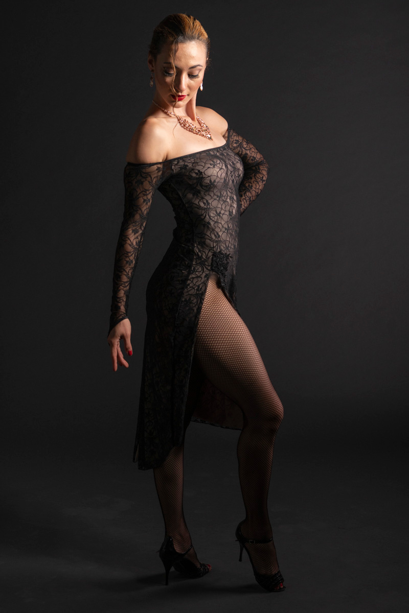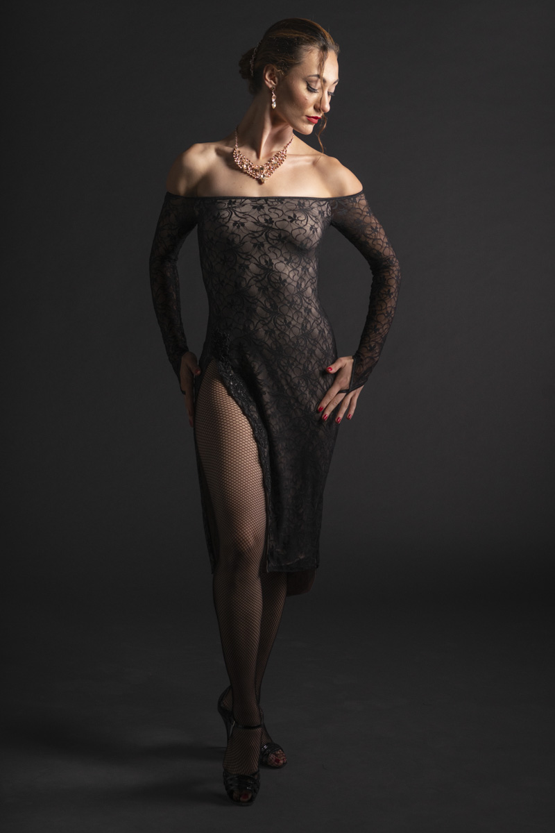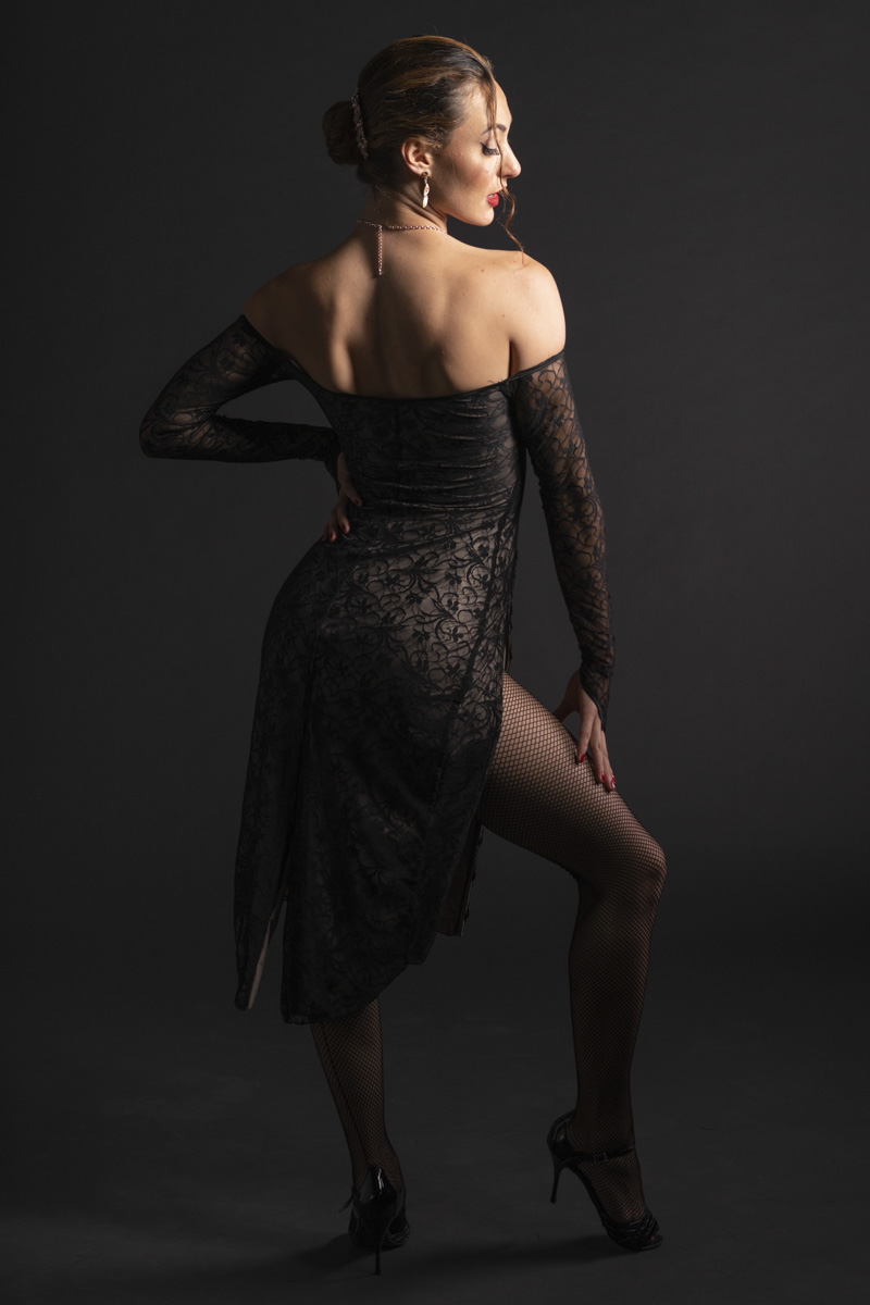 Our midnight black floral lace brings alluring elegance and a new level of chic to any performance. This flirty off shoulder silhouette has become one of our most popular styles. Try one of our dramatic colors to contrast. f