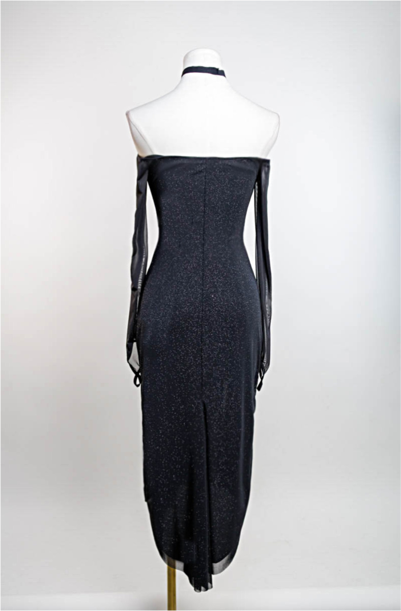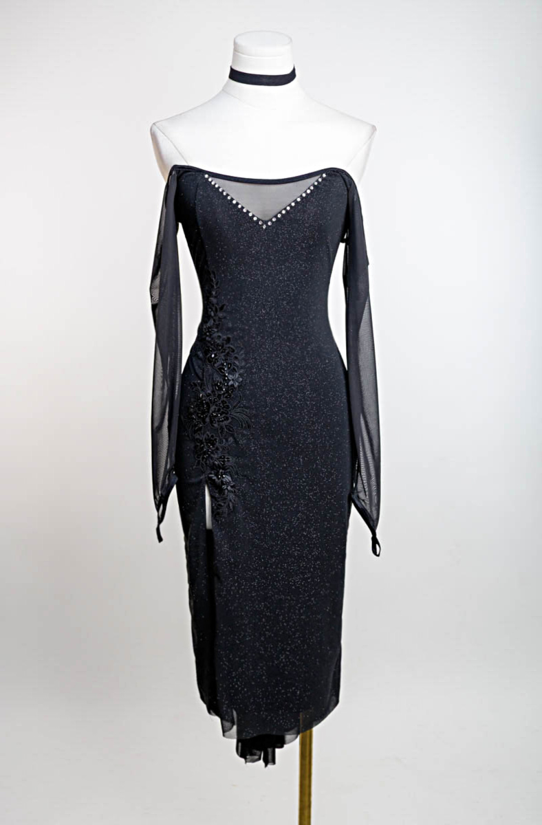 See yourself dance in an all over black silhouette that shimmers subtle bling. This flirty off shoulder silhouette has become one of our most popular styles.