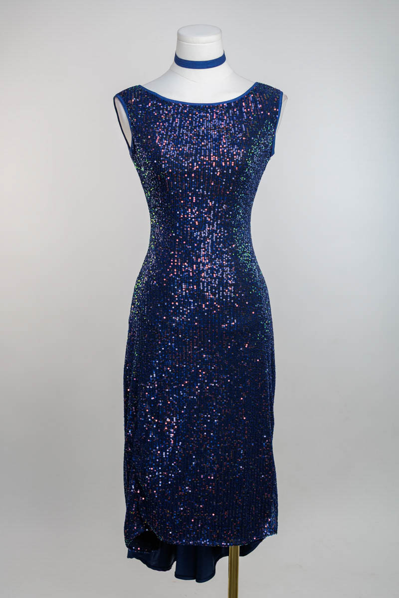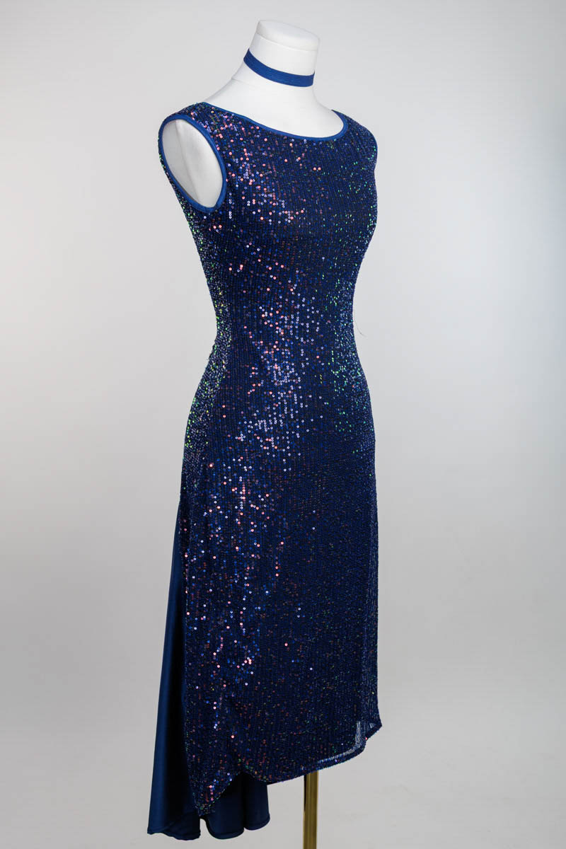 Argentine Tango fantasia performance dress in a classic and elegant silhouette. Made of a special mesh sequin stretch. A subtle contrasted back panel creates flow and elegance.