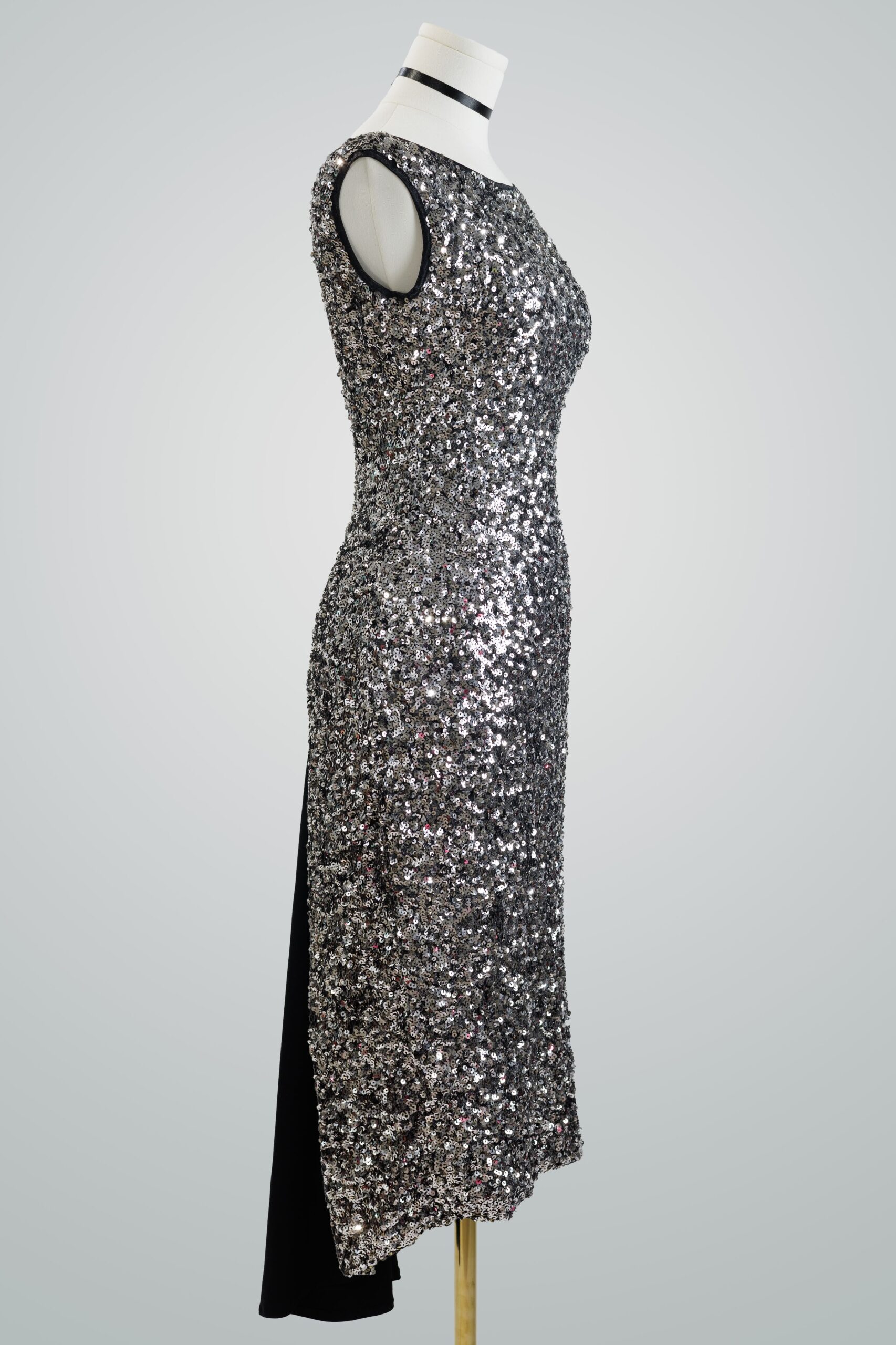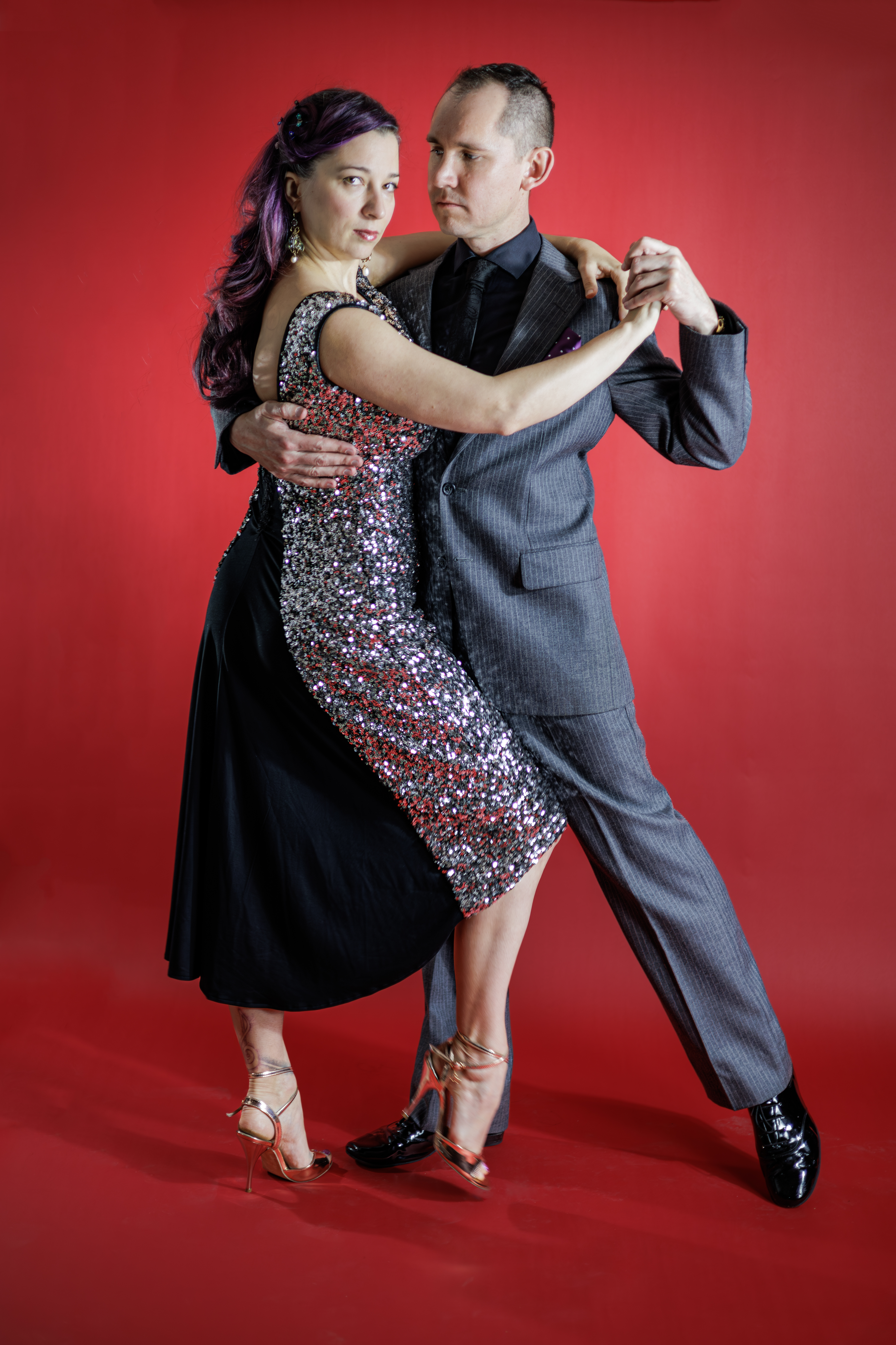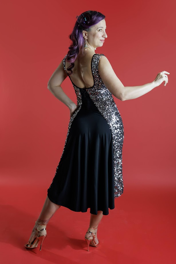 Argentine Tango fantasia performance dress in a classic and elegant silhouette. Made of a special mesh sequin stretch. A subtle black contrasts the back with layers of sheer panels and trim embellishments.